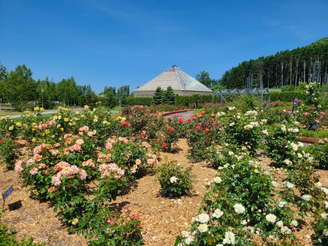 いわみざわバラ公園は約4万㎡の広さを持つ道内最大級のバラ園です。約630品種8,800株のバラやハマナスを無農薬で栽培し、6月下旬から7月中旬と9月中旬から10月中旬に見頃を迎えます。園内には温室「色彩館」もあり、年間を通じて楽しめます。